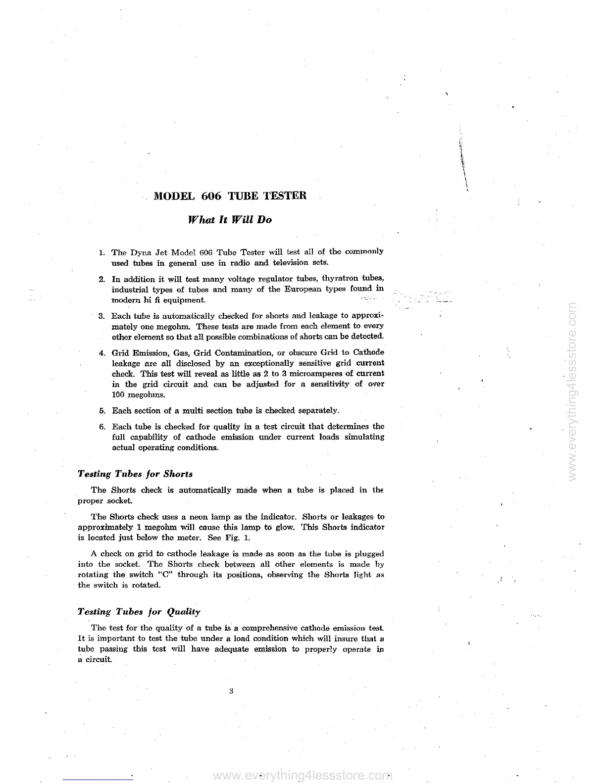 B&K 606 - Model 606 Tube Tester Overview; What It Will Do; Testing Tubes for Shorts; Testing Tubes for Quality