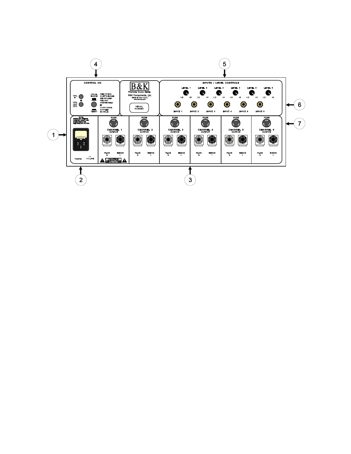 5. Level controls - For adjusting the input level of each channel into the amplifier.