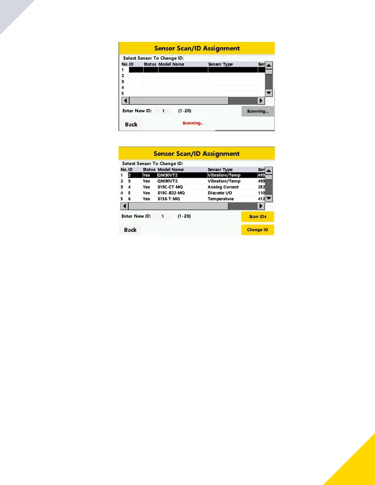 Sensor Scan/ID Assignment screen with the sensors list populated