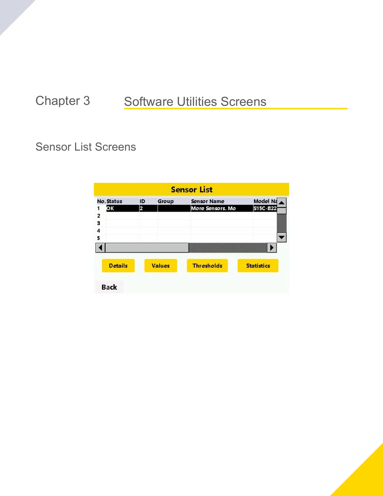 SelecttheSensor Listbuttontoopenthelistofcommissionedsensors/converters.UsetheBackbuttontoreturntotheprevi