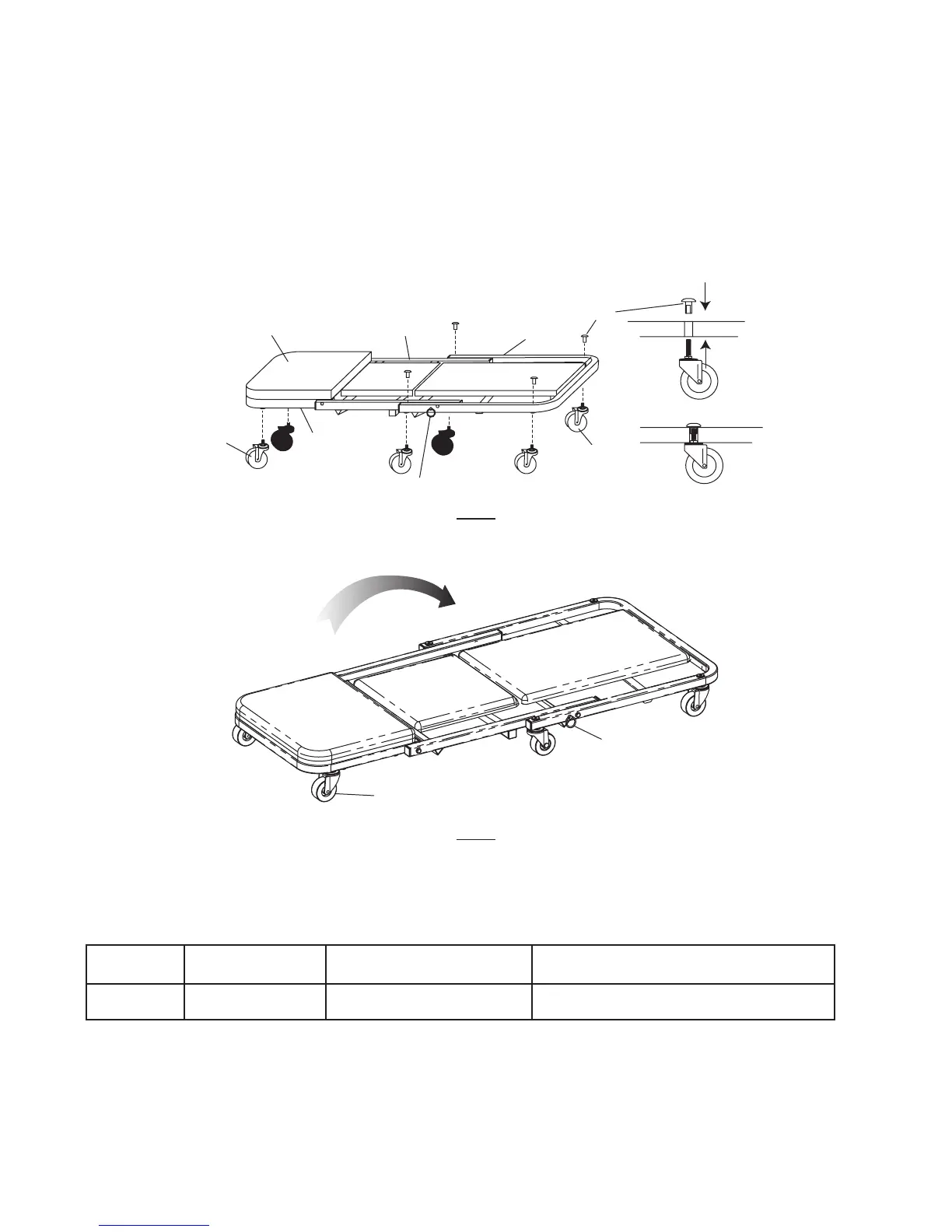 1.Insert the 6 casters into the frame of assembled creeper body so that caster wheels will contact oor. Use