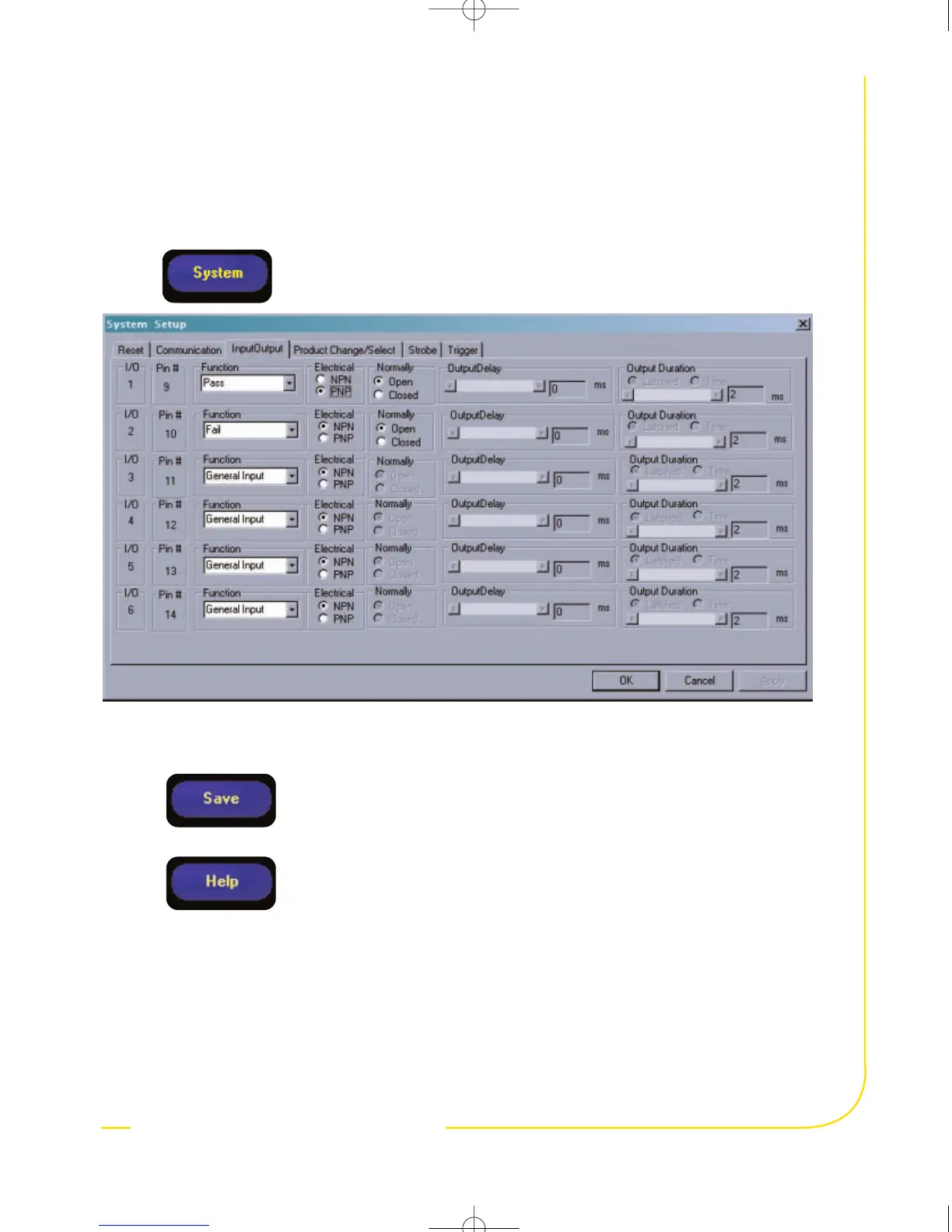 Use the System Setup screen to change discrete I/O, the communication port, the product