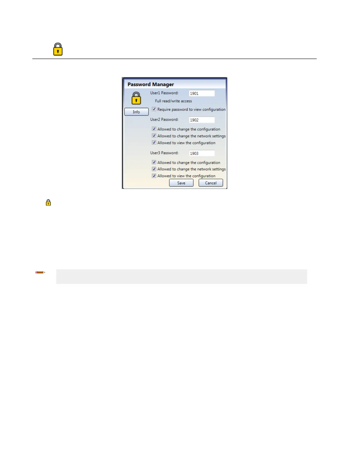 to three user passwords to manage different levels of access to the configuration settings. The password for User1 provides