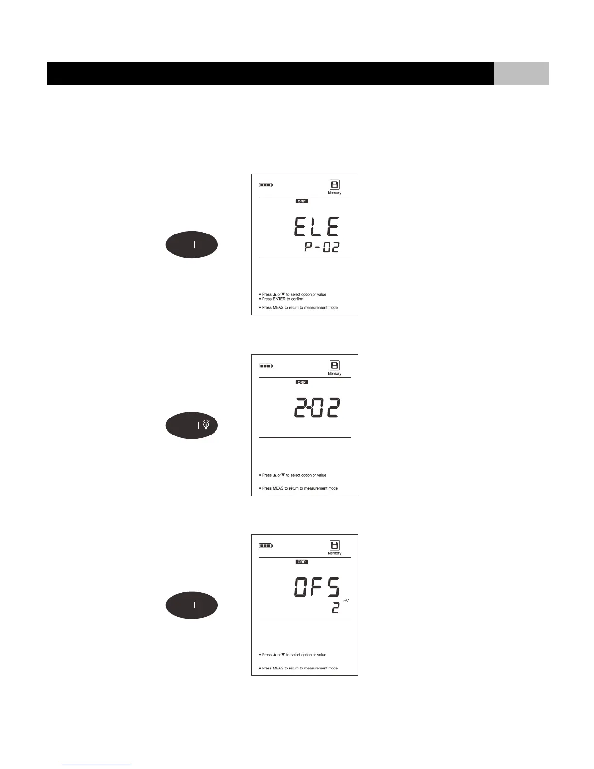 2. Press or key until the meter shows “ELE/P-02” (Electrode Diagnosis).