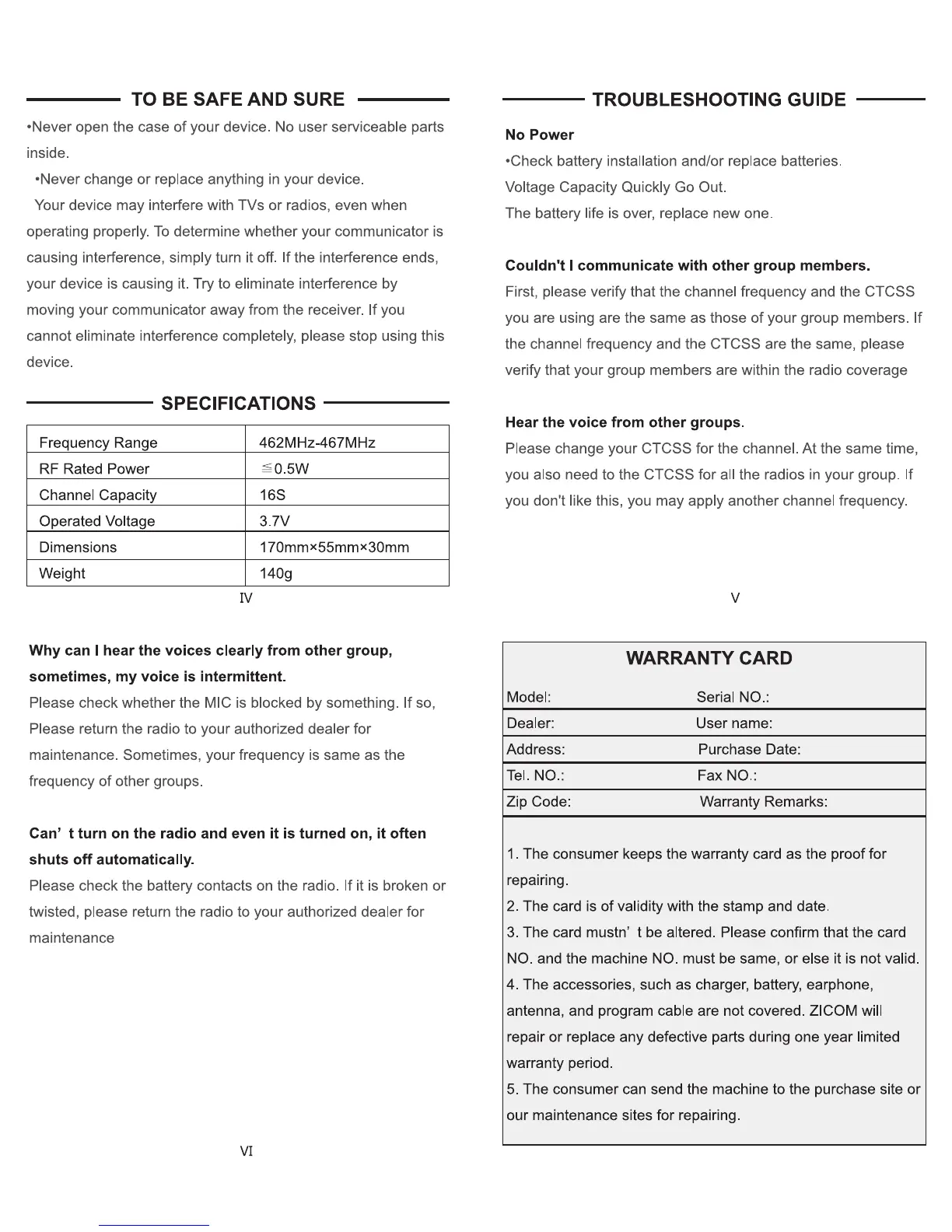 Baofeng BF-88A - Safety and Usage Precautions; General Safety Warnings; Specifications; Troubleshooting Guide