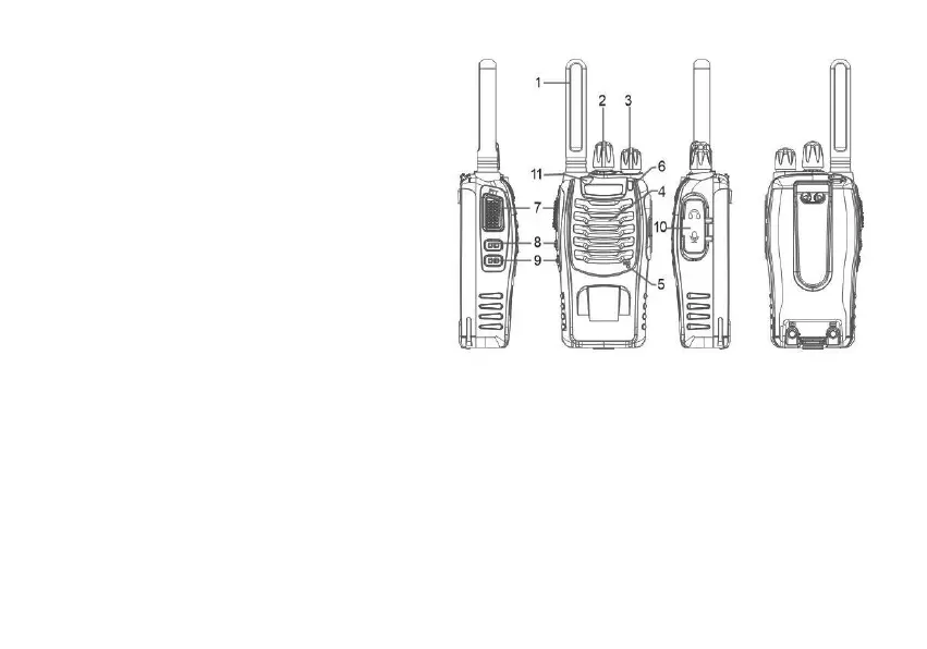 9. Sivupainike 2: Paina painiketta lyhyesti kytkeäksesi päälle/pois taskulampun radiopuhelimen yläreunassa.