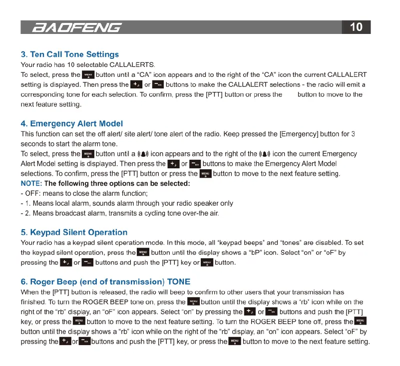Baofeng BF-88ST PRO - Ten Call Tone Settings; Emergency Alert Model; Keypad Silent Operation; Roger Beep (end of transmission) TONE