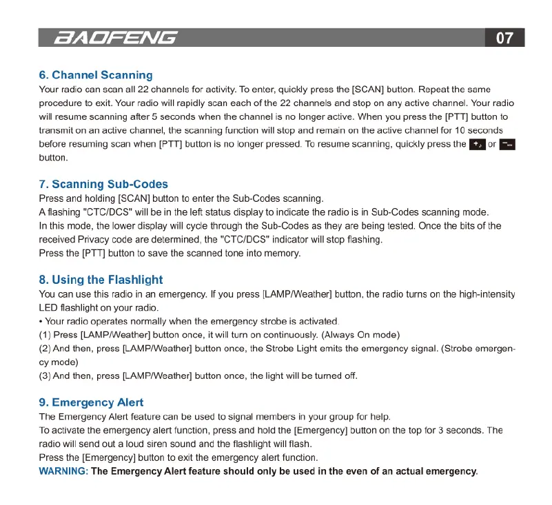Baofeng BF-88ST PRO - Channel Scanning; Scanning Sub-Codes; Using the Flashlight; Emergency Alert