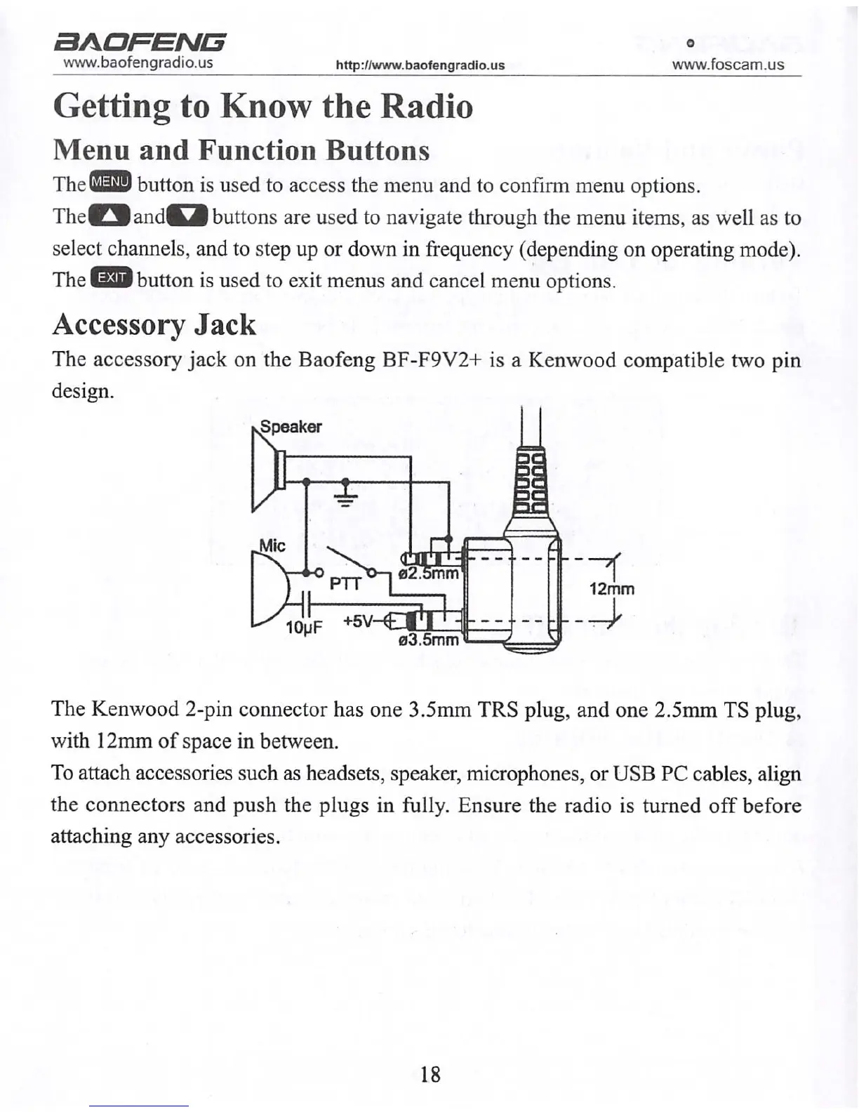 The accessory jack on the Baofeng BF-F9V2+ is a Kenwood compatible two pin
