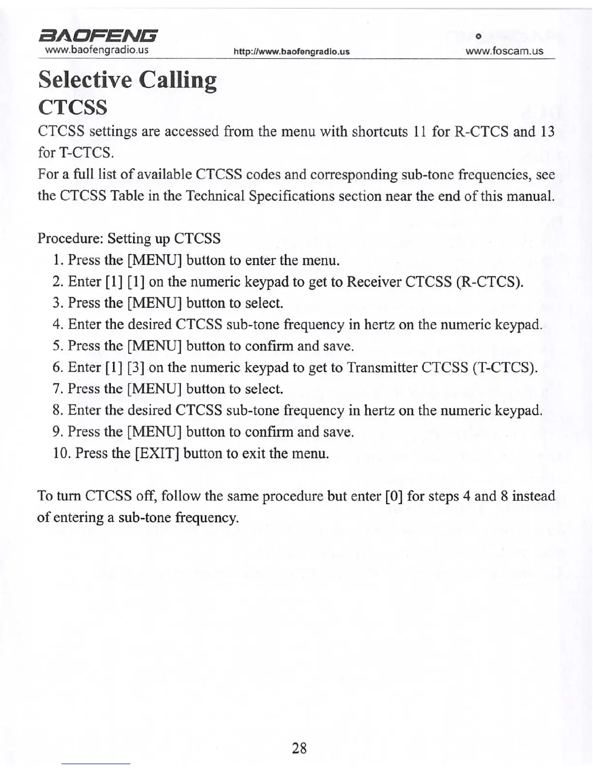 To turn CTCSS off, follow the same procedure but enter [0] for steps 4 and 8 instead