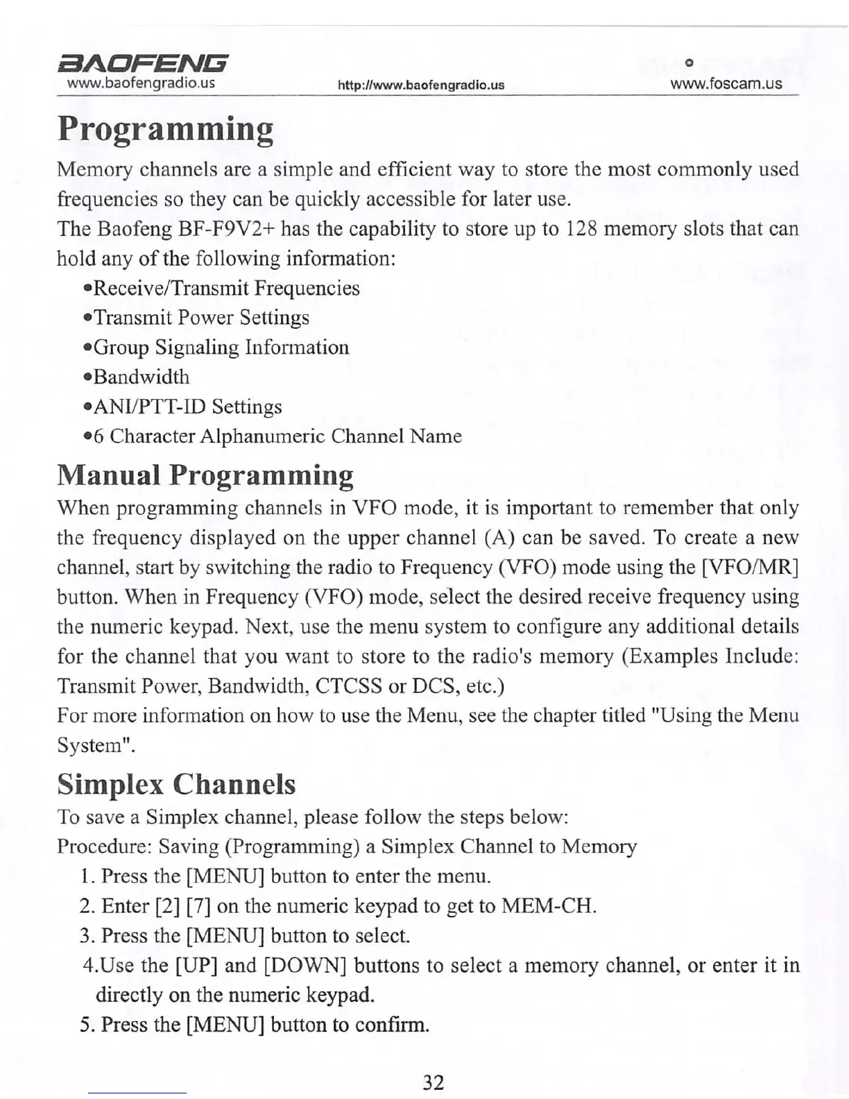 Baofeng BF-F9V2+ - Programming; Manual Channel Programming