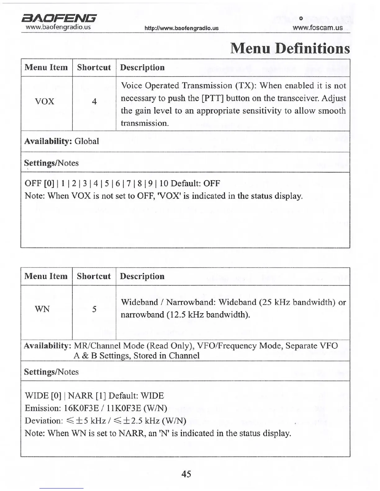 Availability: MR/Channel Mode (Read Only), VFO/Frequency Mode, Separate VFO