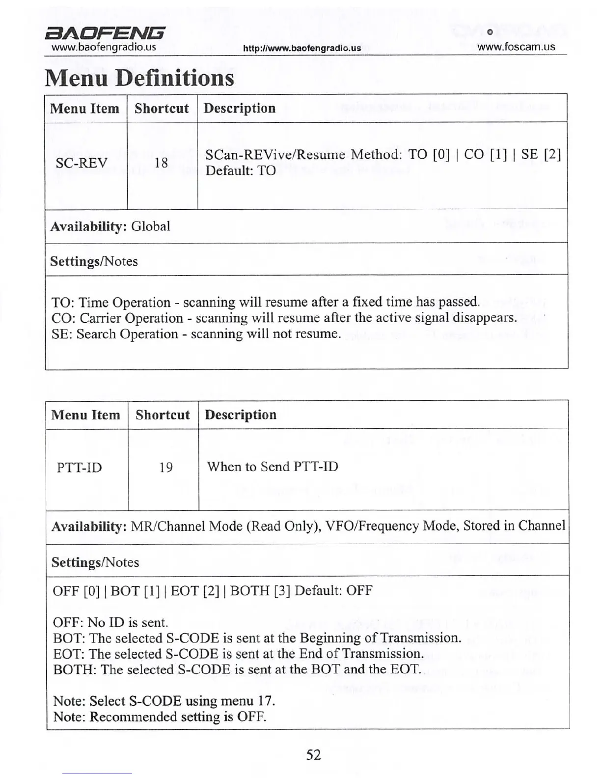 Availability: MR/Channel Mode (Read Only), VFO/Frequency Mode, Stored in Channel