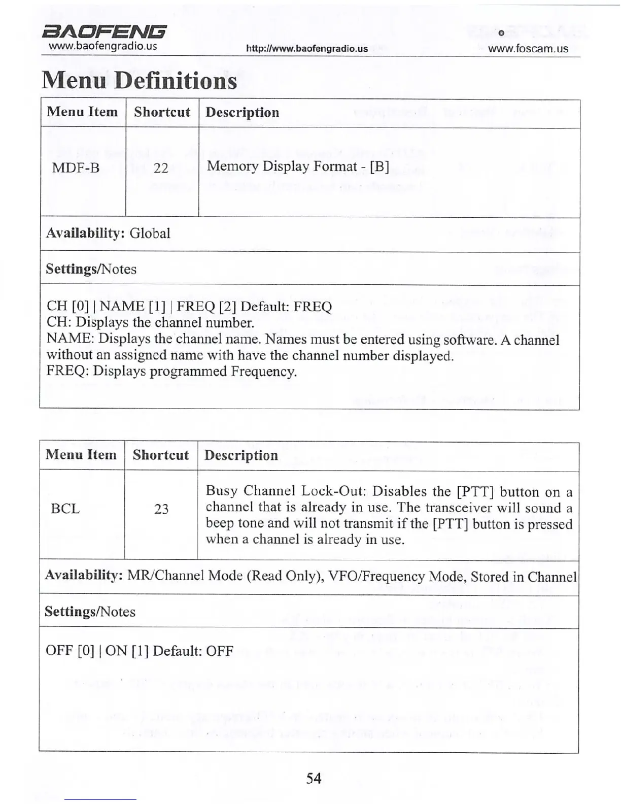 Availability: MR/Channel Mode (Read Only), VFO/Frequency Mode, Stored in Channel