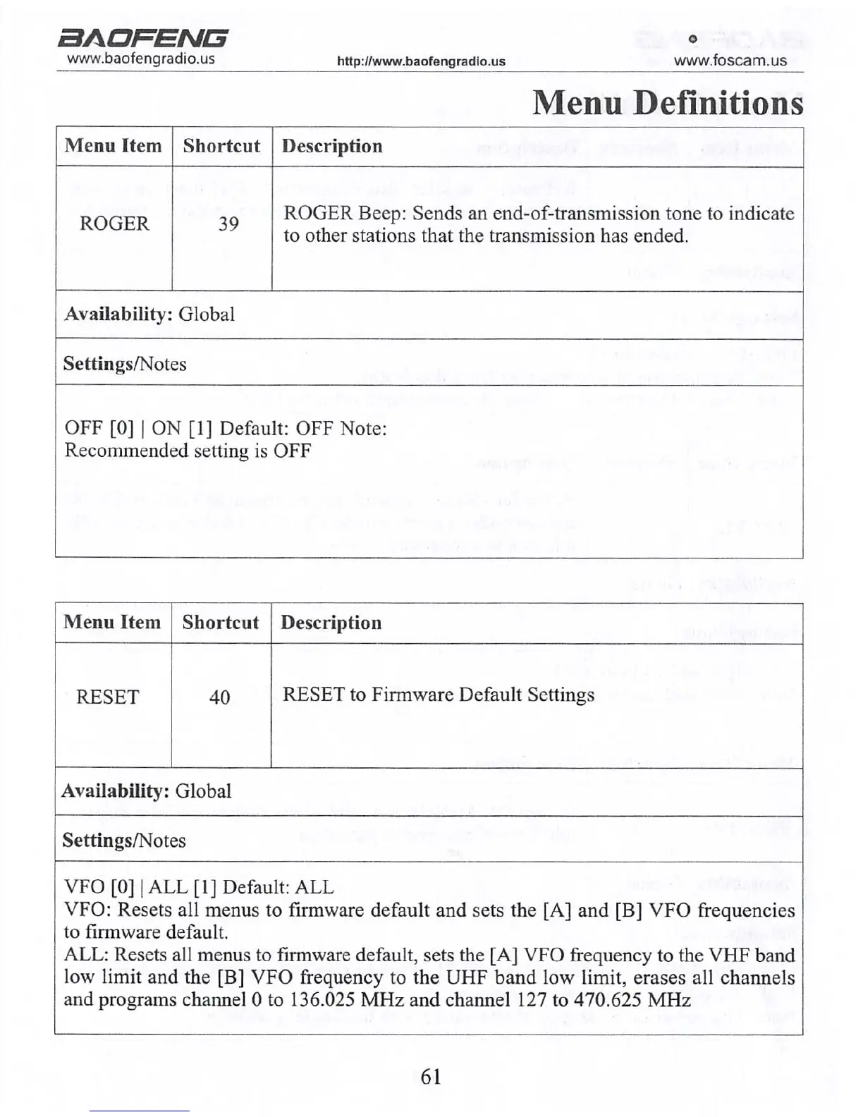 VFO: Resets all menus to firmware default and sets the [A] and [B] VFO frequencies