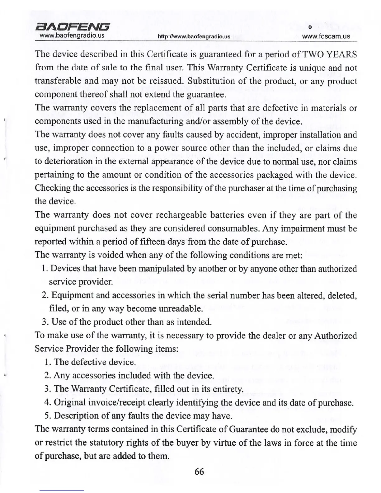 from the date of sale to the final user. This Warranty Certificate is unique and not
