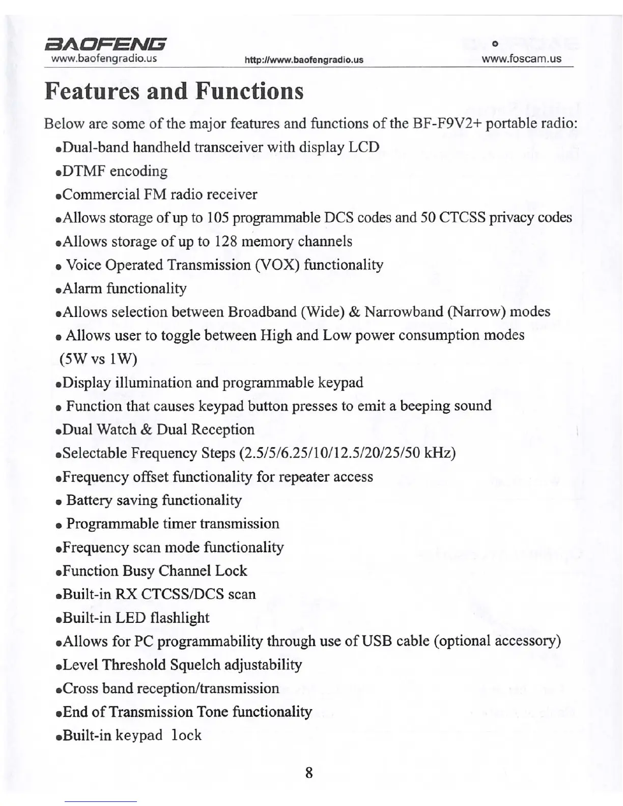 Below are some of the major features and functions of the BF-F9V2+ portable radio: