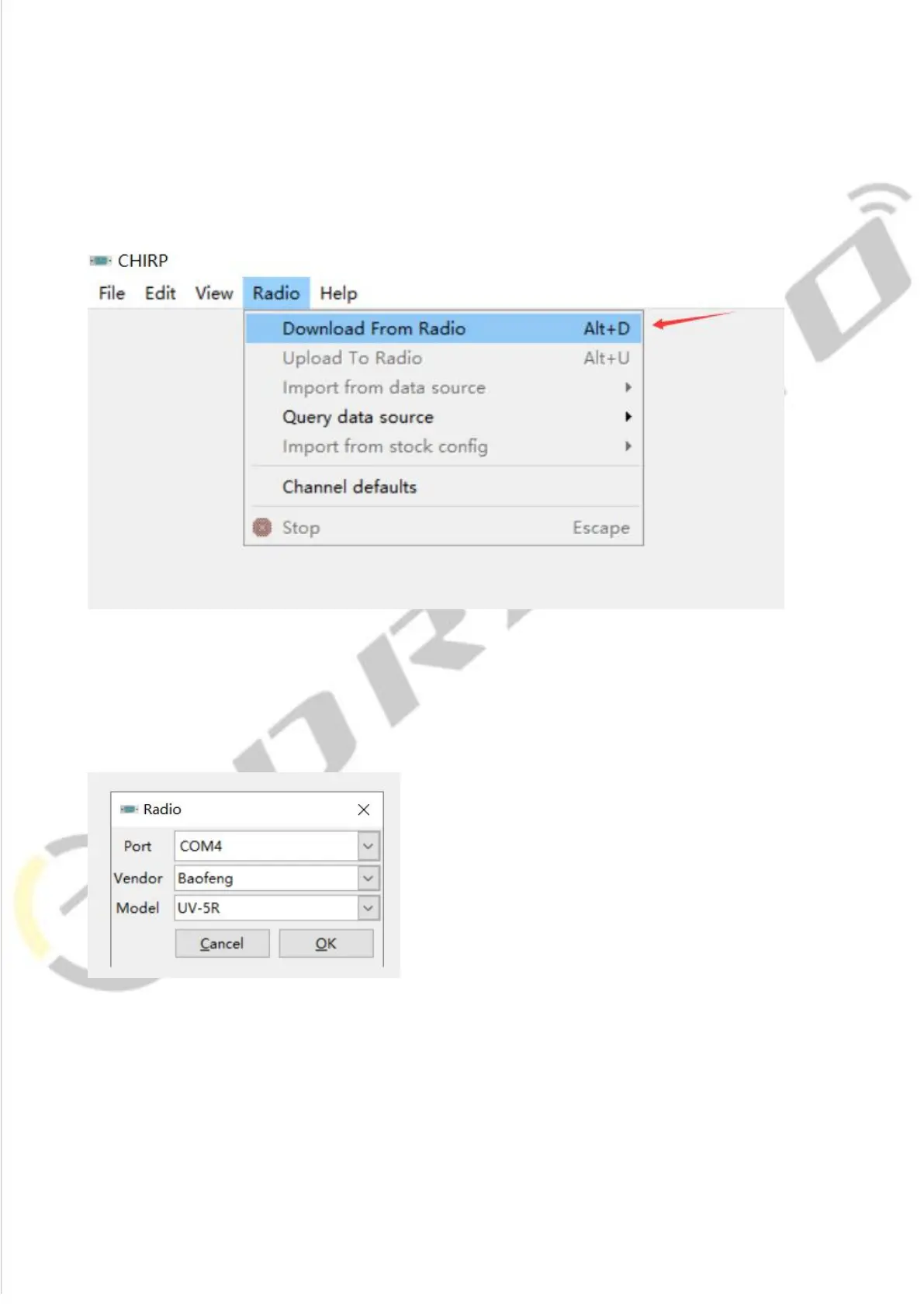 1) Open the CHIRP software (Latest Version), click "Download From Radio" under