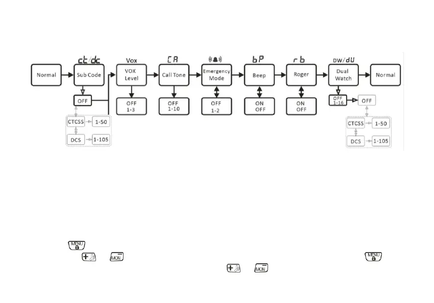 4) By pushing the or button the display will show CTCSS (ct blinking) or DCS (dc blinking); press to enter
