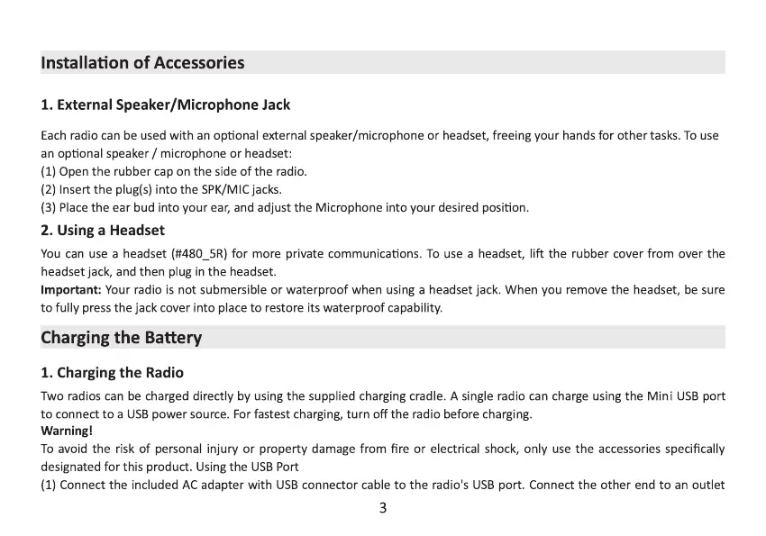 Important: Your radio is not submersible or waterproof when using a headset jack. When you remove the headset, be sure
