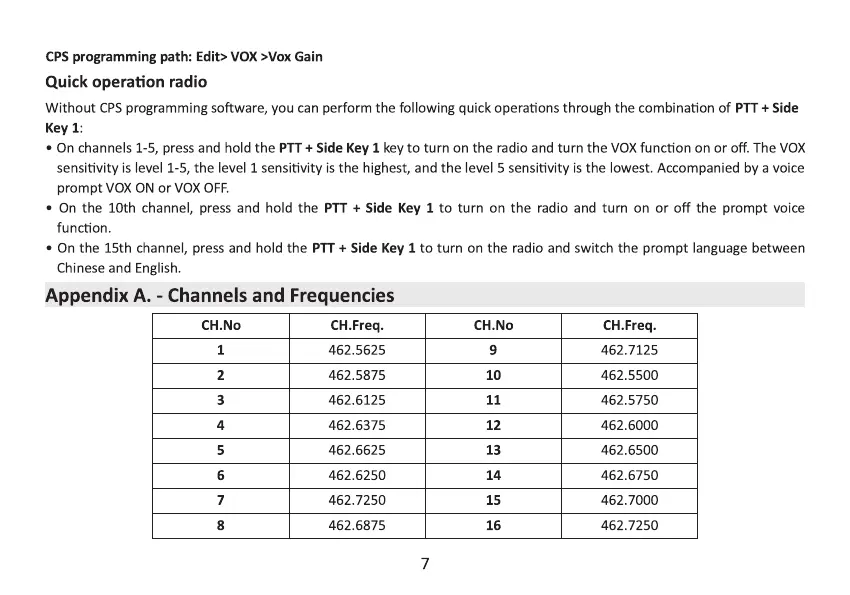 • On channels 1-5, press and hold the PTT + Side Key 1 key to turn on the radio and turn the VOX function on or off. The VOX