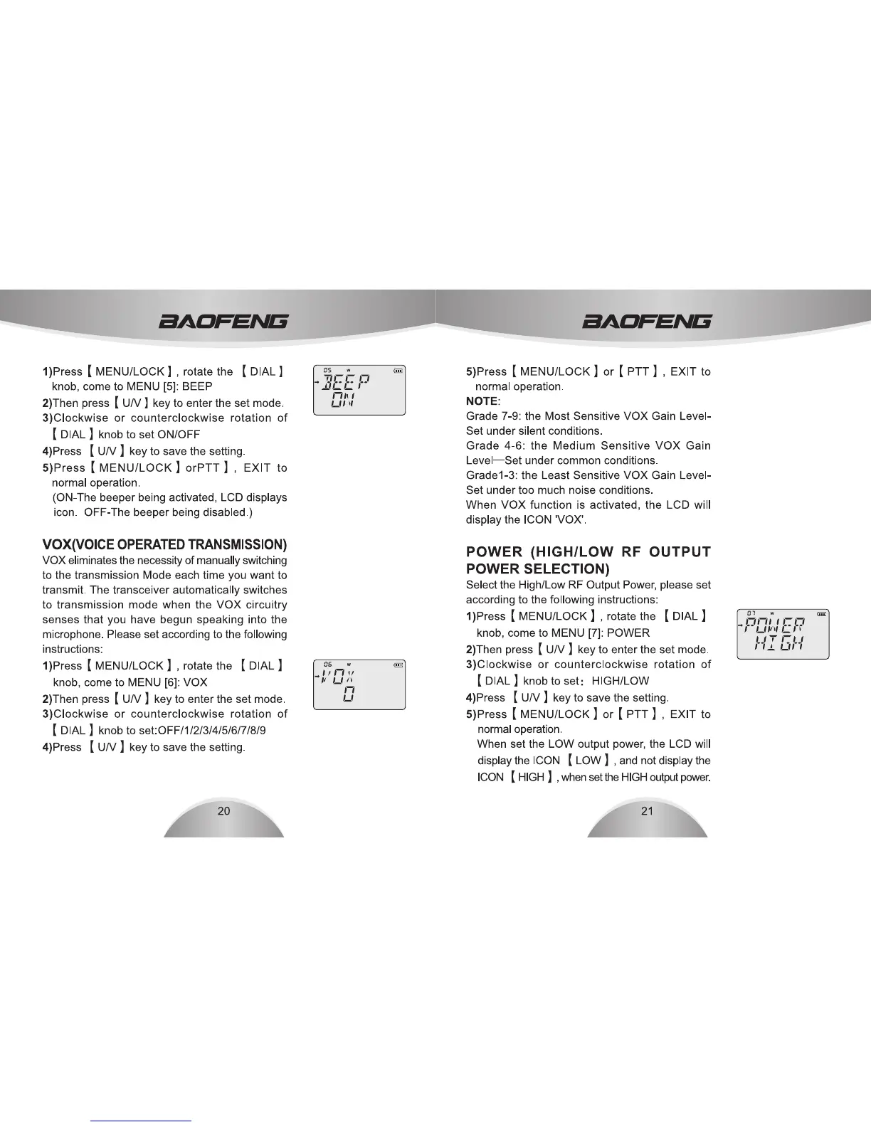 Baofeng UV-3R plus - Advanced Operation: VOX, POWER; VOX Function Setup; RF Output Power Selection