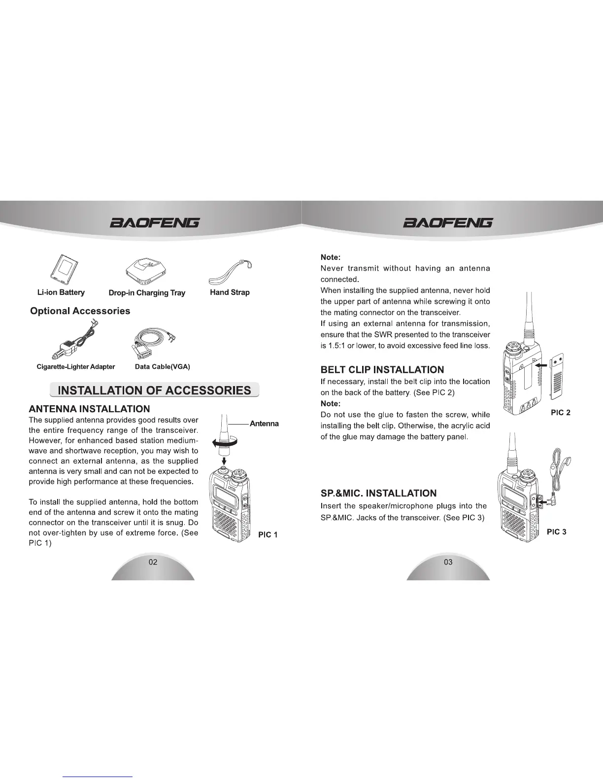Baofeng UV-3R plus - Antenna Installation; Belt Clip Installation; Sp. and MIC. Installation; Optional Accessories