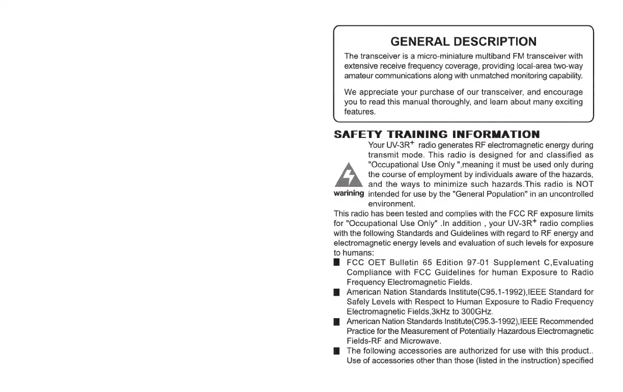 Baofeng UV-3R+ - General Description; Safety Training Information