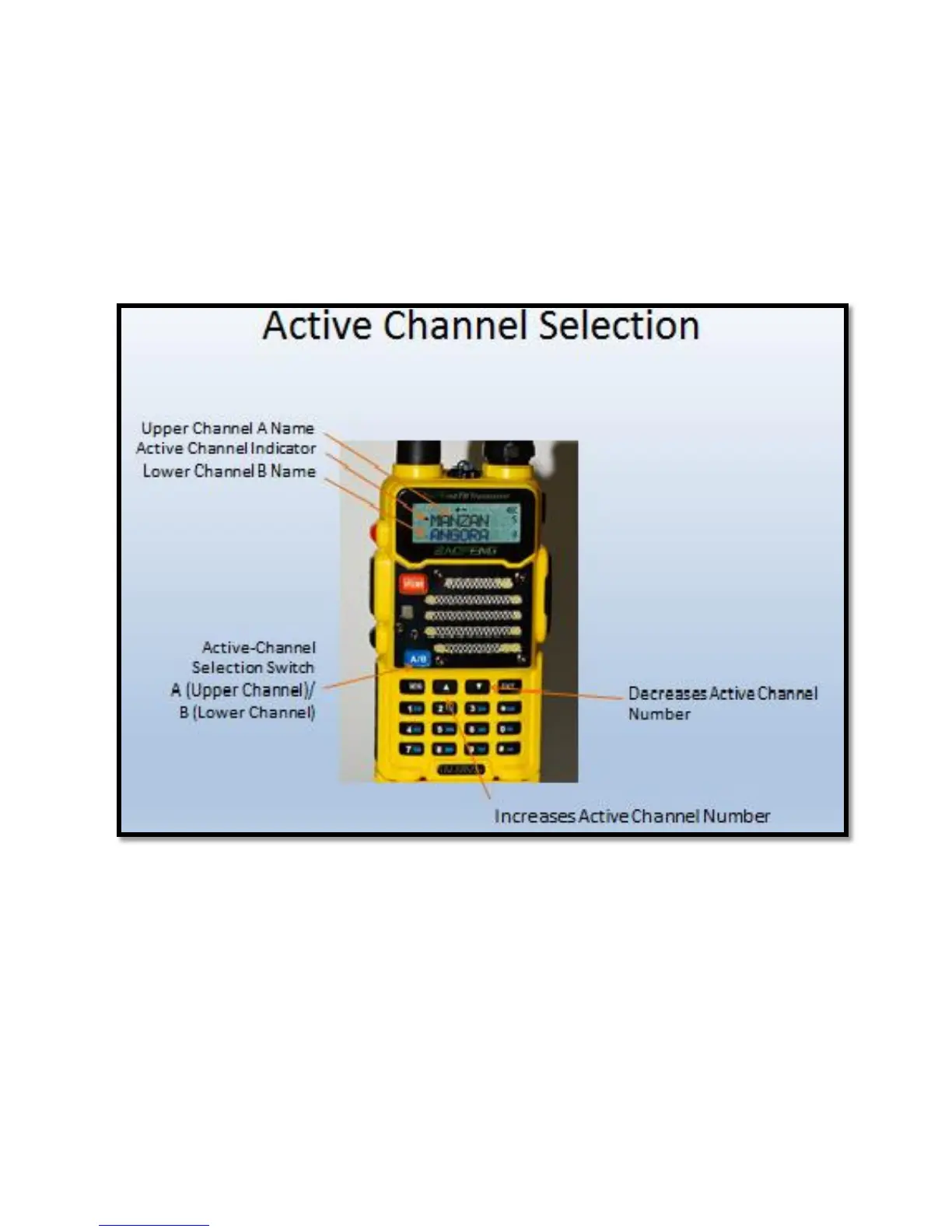 Refer to Figure 2 noting the “Active Channel Indicator” which consists of a small caret symbol