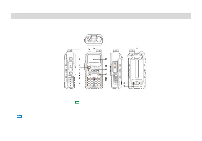 10. Antenna jack. 11. LED flashlight 12. Color LCD