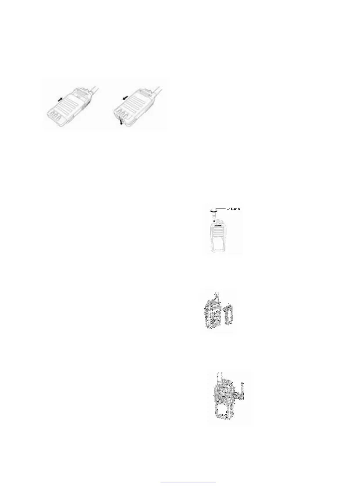 1. Make the battery aim at the slide way of transceiver back, then push forward the battery till the