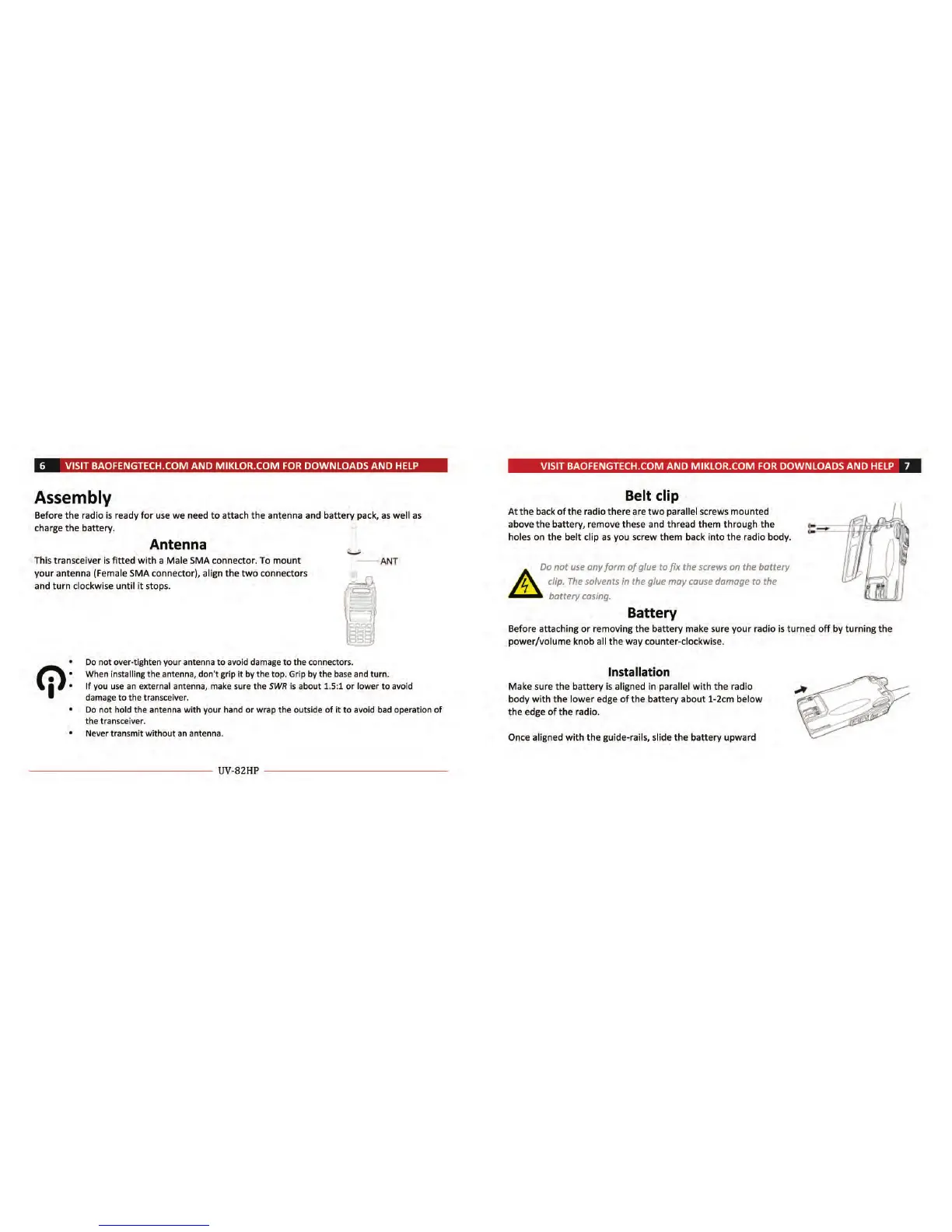 Baofeng UV-82HP - Radio Assembly; Antenna Installation; Battery Installation and Removal