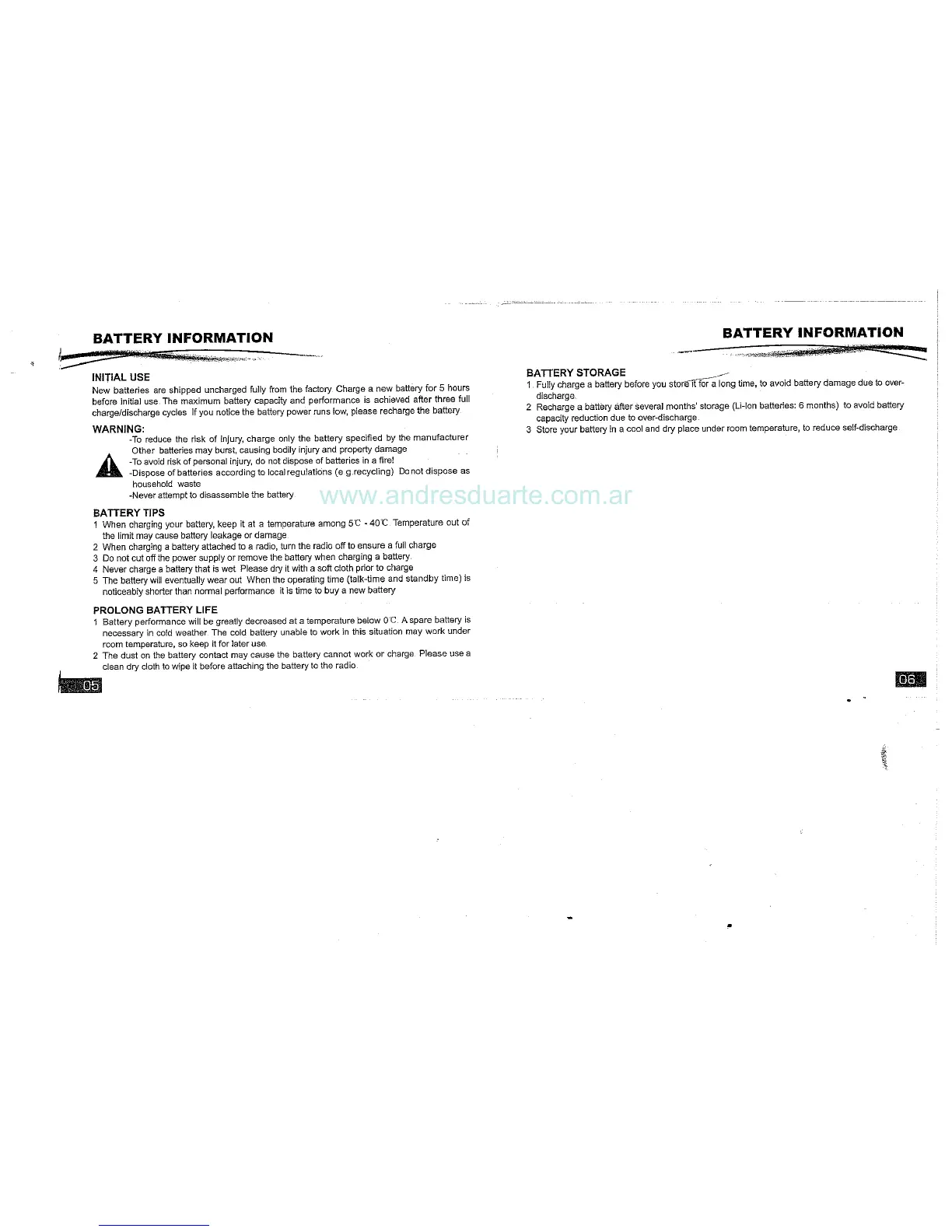 Baofeng UV-85 - Battery Information; Initial Battery Use and Charging; Battery Care and Storage