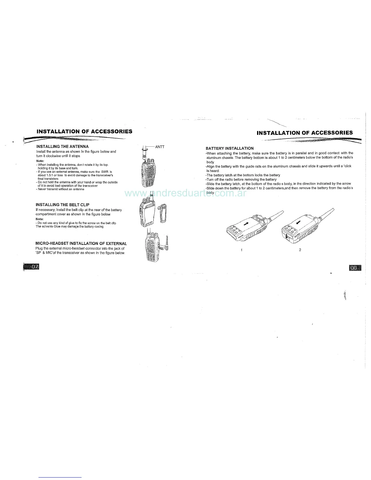 Baofeng UV-85 - Installation of Accessories; Antenna and Belt Clip Installation; Battery and External Accessory Installation