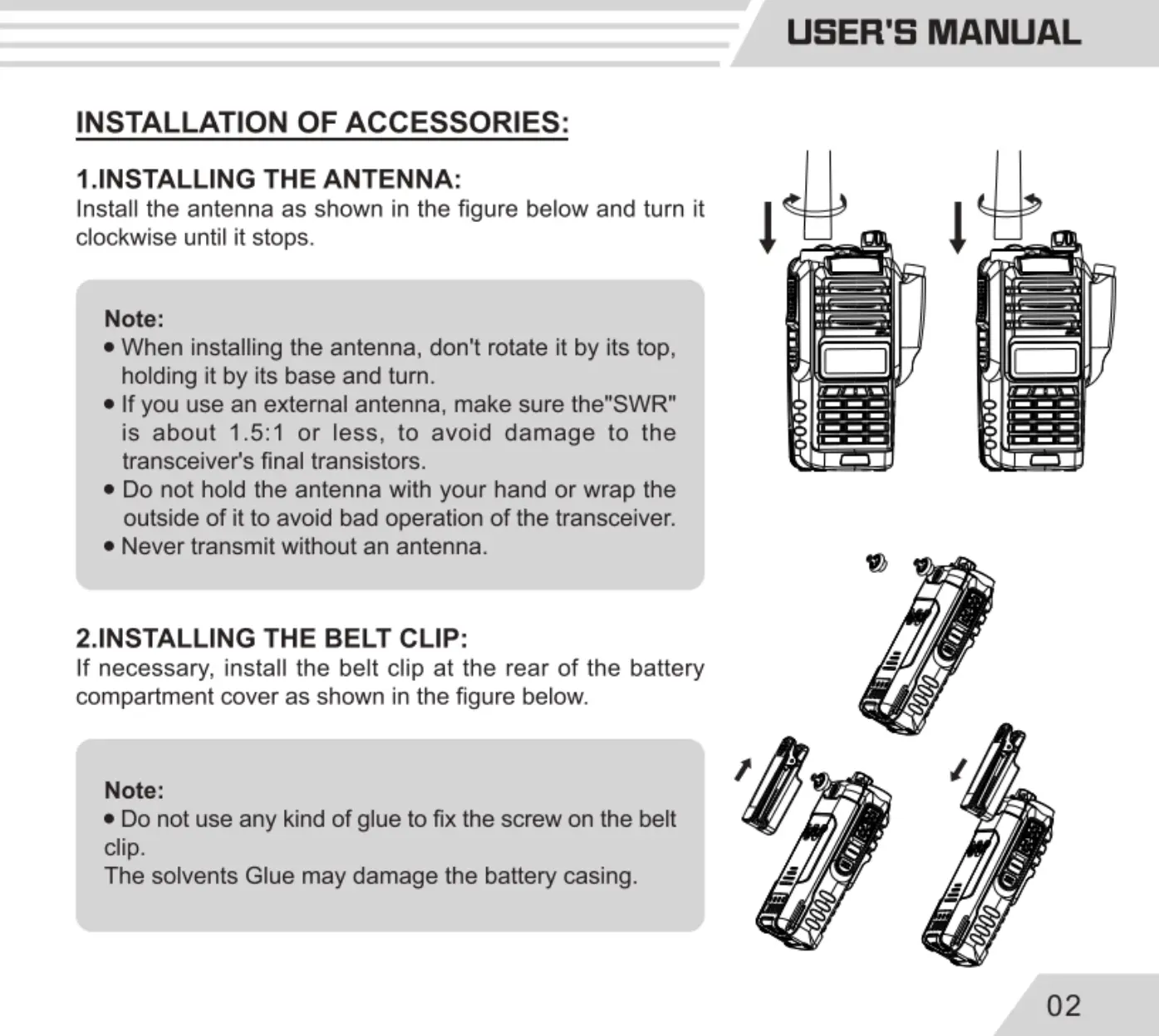 Baofeng UV-9R - Installation of Accessories; Installing the Antenna; Installing the Belt Clip