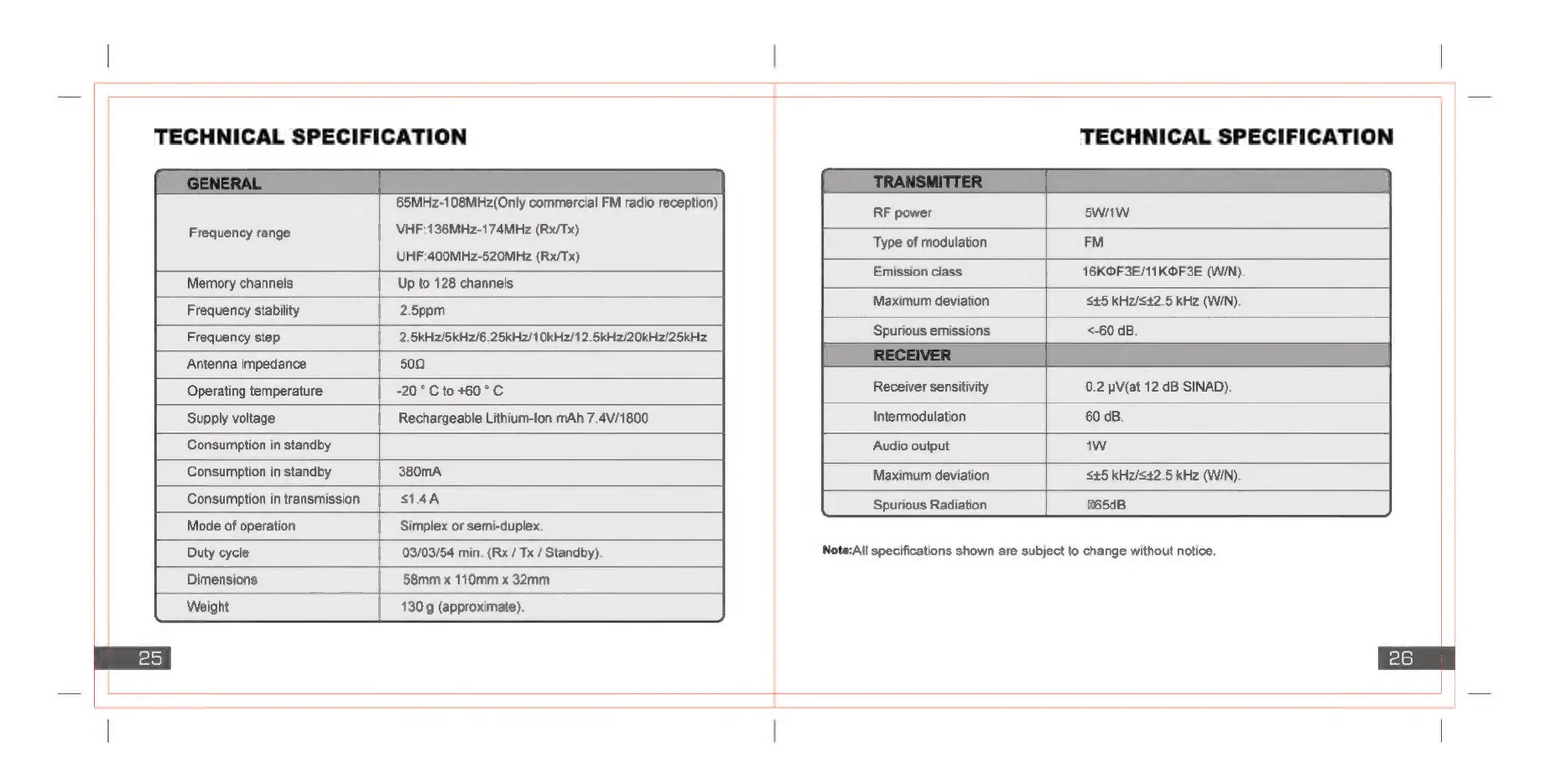 Baofeng UV82 - Technical Specifications: General; General Specifications; Technical Specifications: Transmitter; Transmitter Specifications