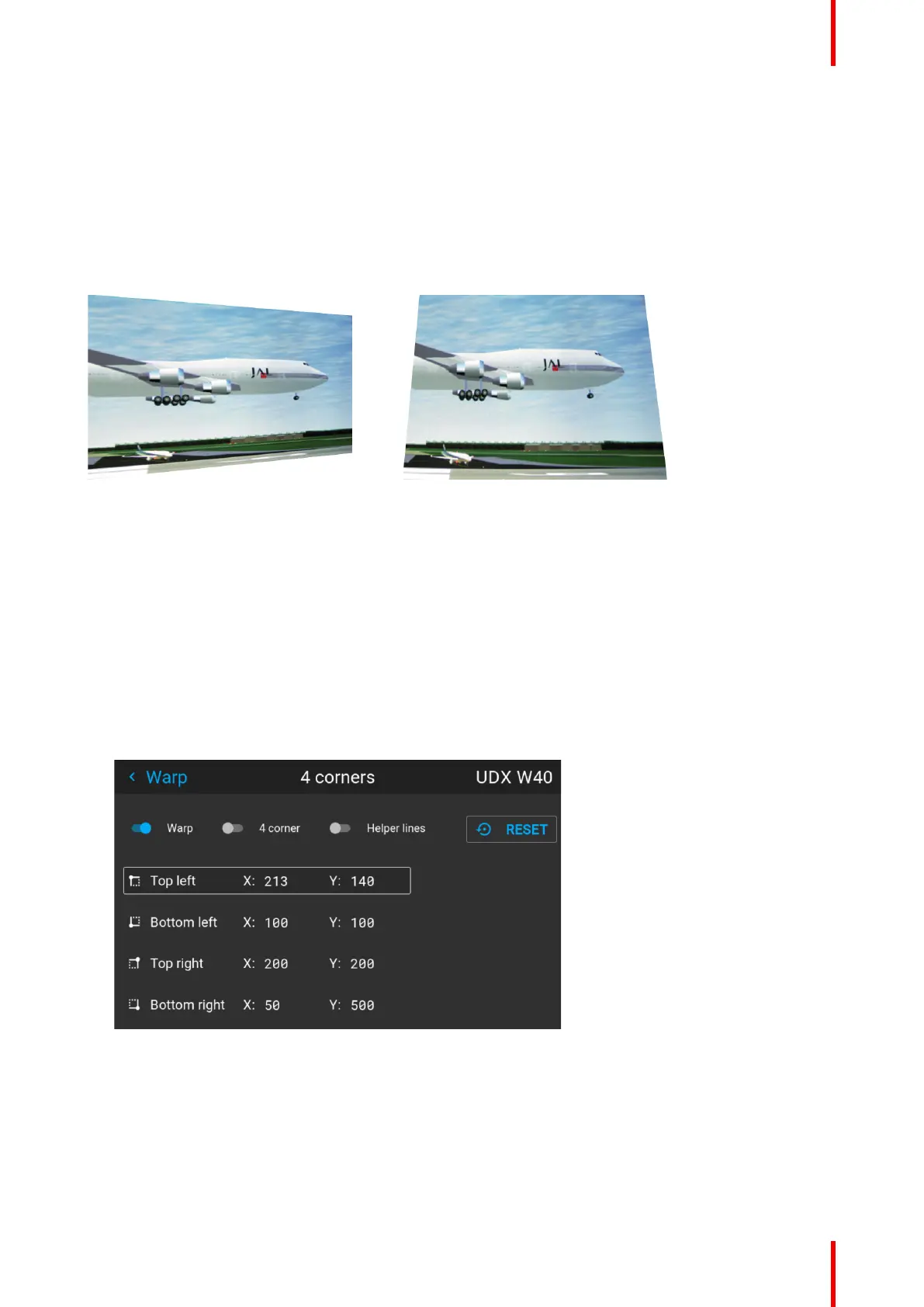 of the X and Y coordinates for each corner. When the warping is complete, exit the menu by using the