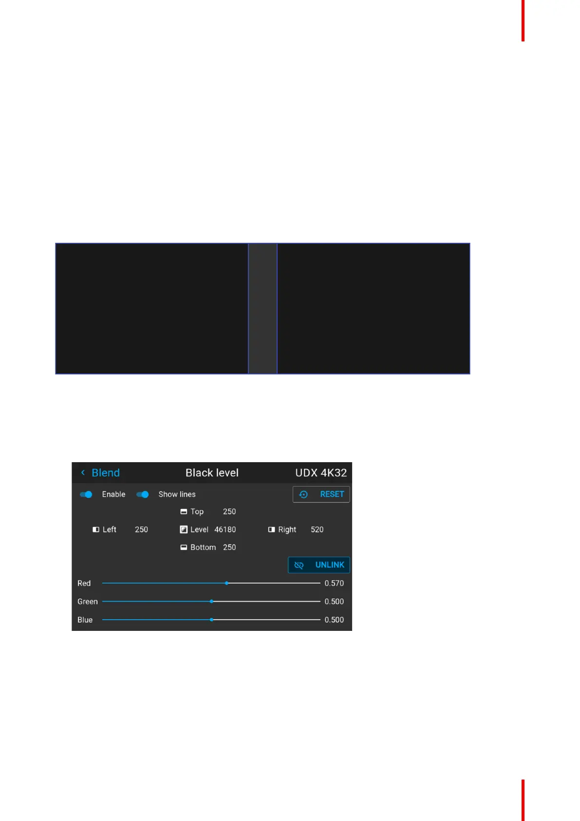 2. Enable the ”Black level” and “Show lines” buttons. A line that indicates the blend zones will be visible on