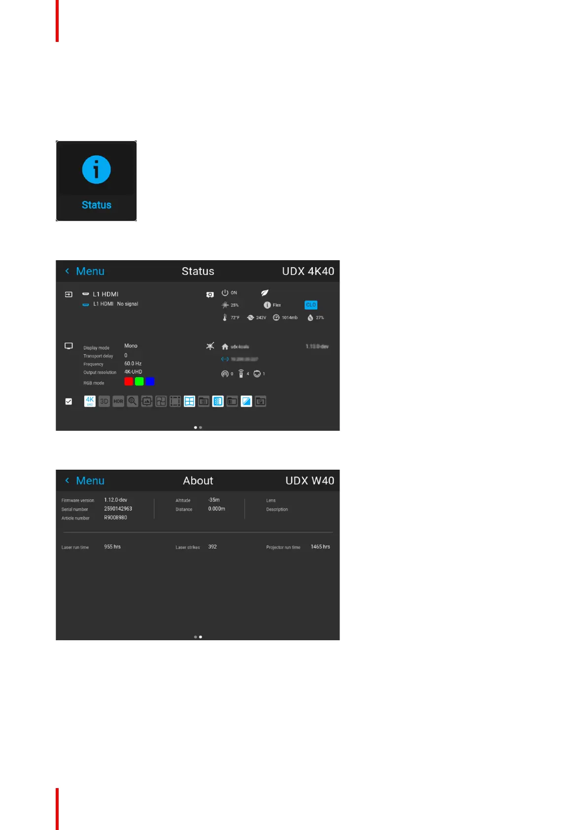 • Projector power and environmental details (e.g. power, temperature, pressure, etc)
