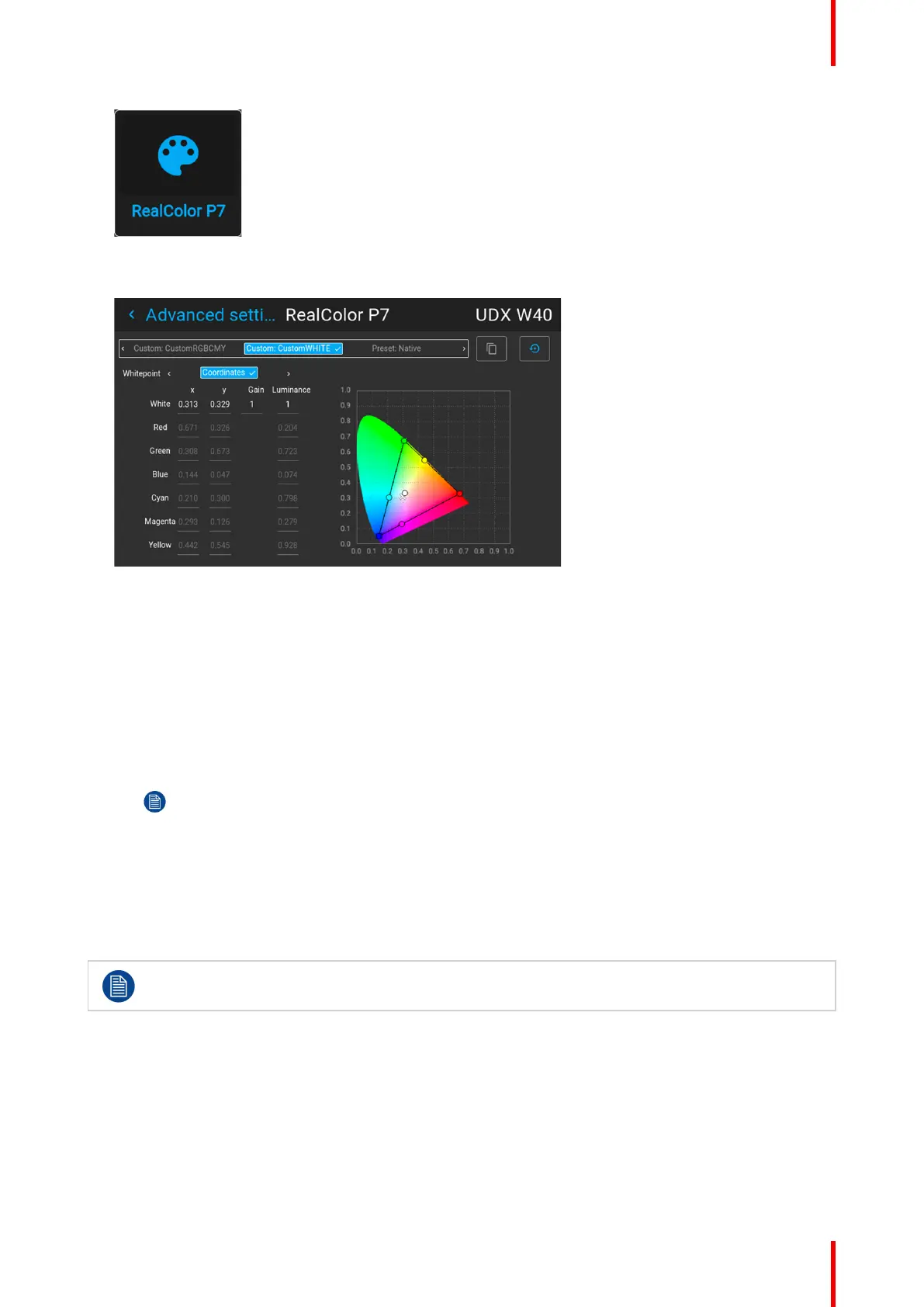 In RGBCMY mode, each color can be given a specific coordinate within the measured color triangle.