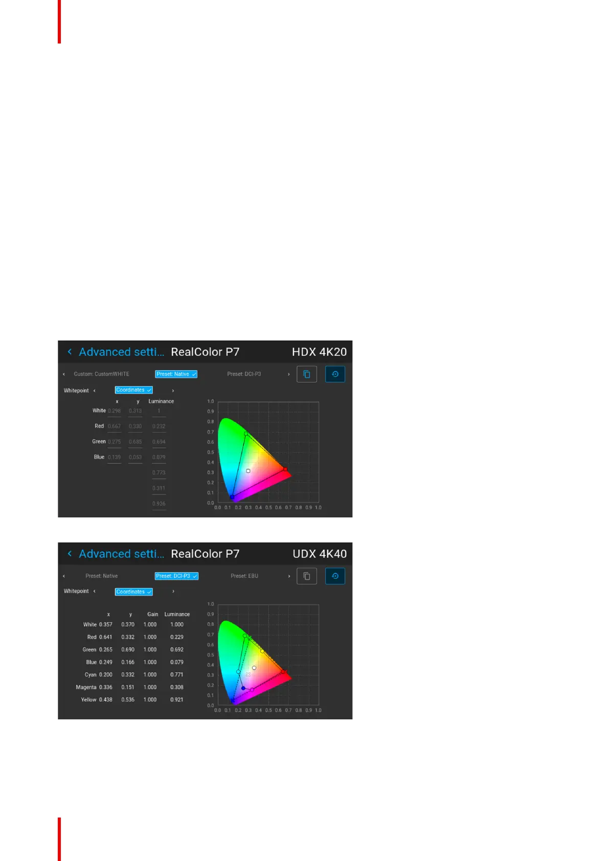 Select the desired preset mode (EBU, Rec709 or SMPTE-C) and select the coordinate within each color