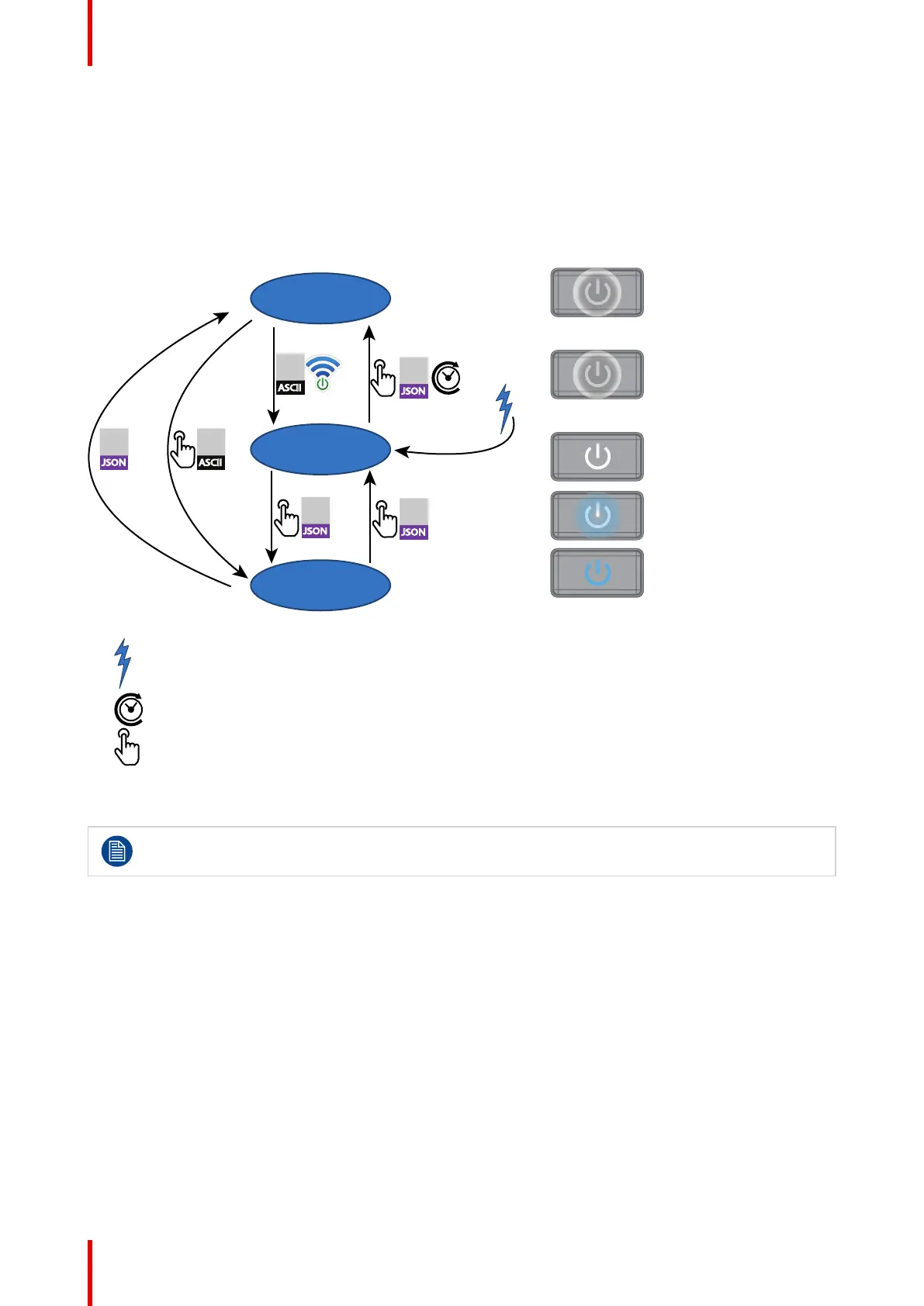 This diagram shows all modes available on the projector (unplug, ON, READY, ECO), and the actions