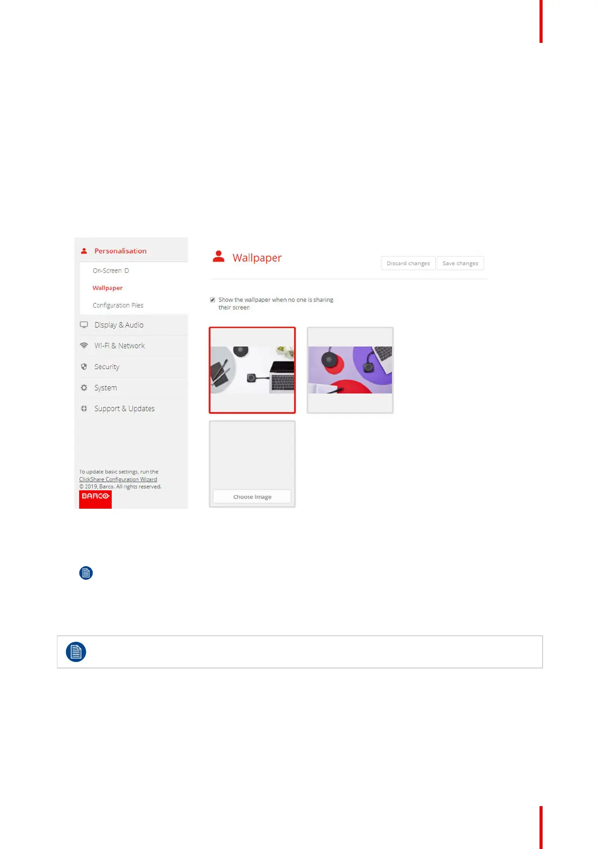 By default two general ClickShare wallpapers are available. The possibility exists to upload personal