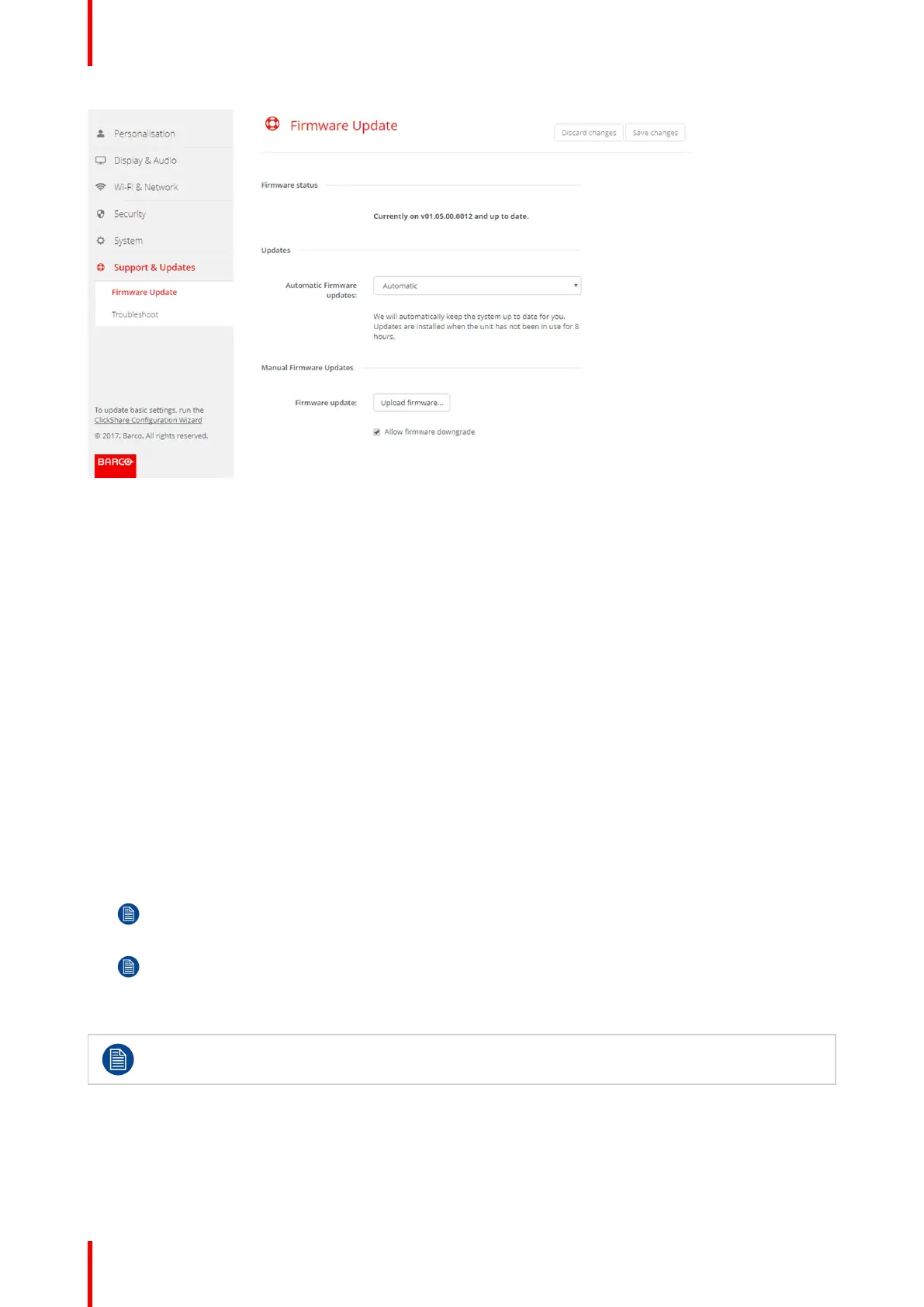 dashboard and firmware page. The update can then be initiated via the Support & Updates > Firmware