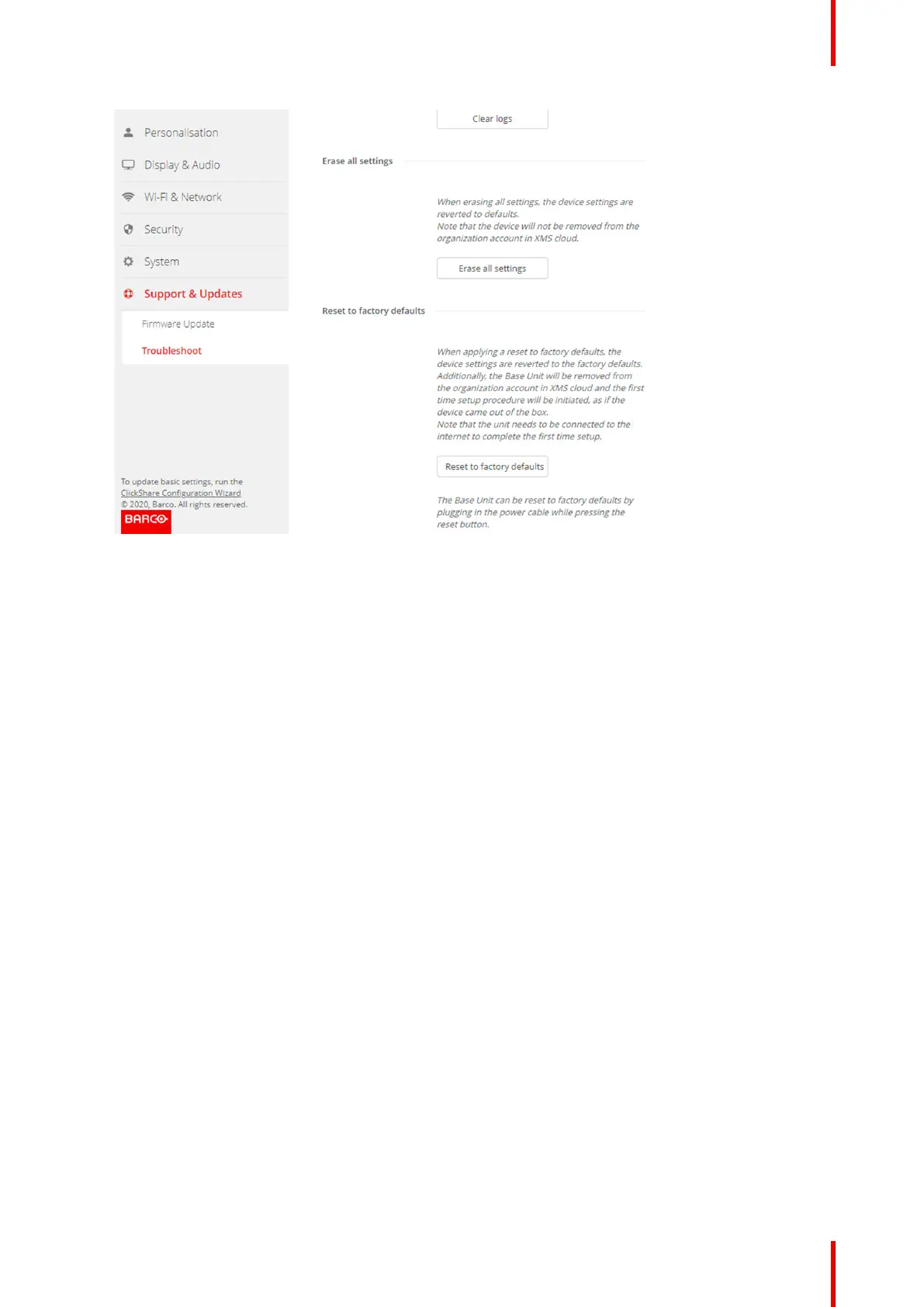 The following message is displayed: “This action will remove all settings of the Base Unit and replace them