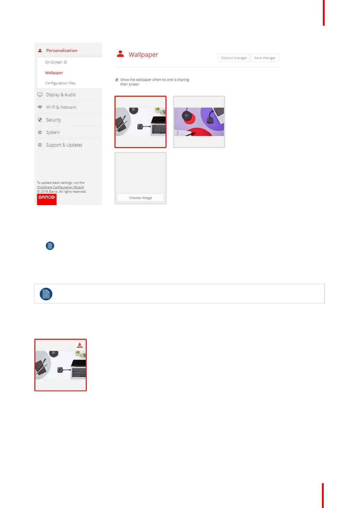 Note: By default two general Barco wallpapers are available.