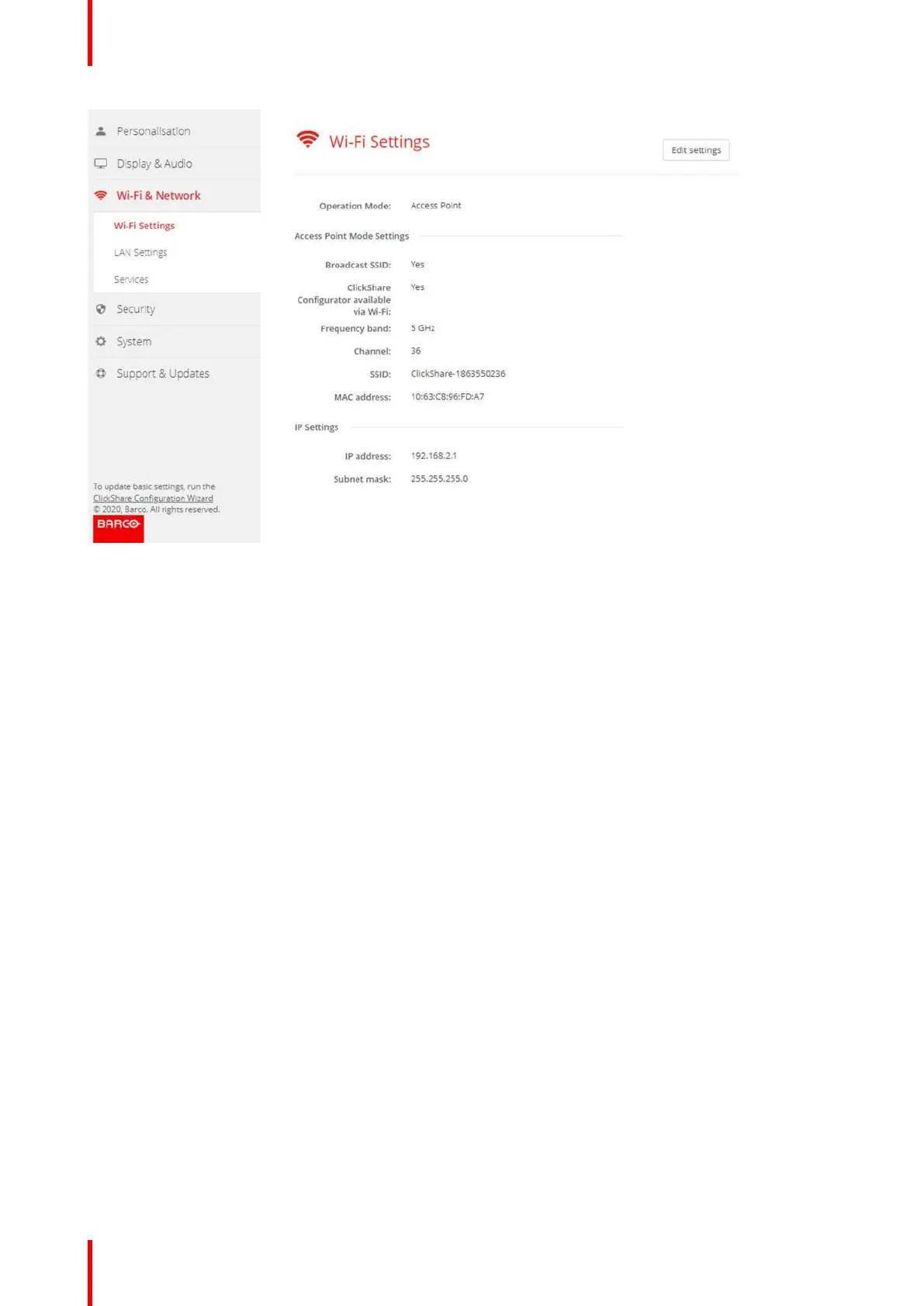 To change any WiFi-setting, click on Edit settings. The view depends on the previous selected operational