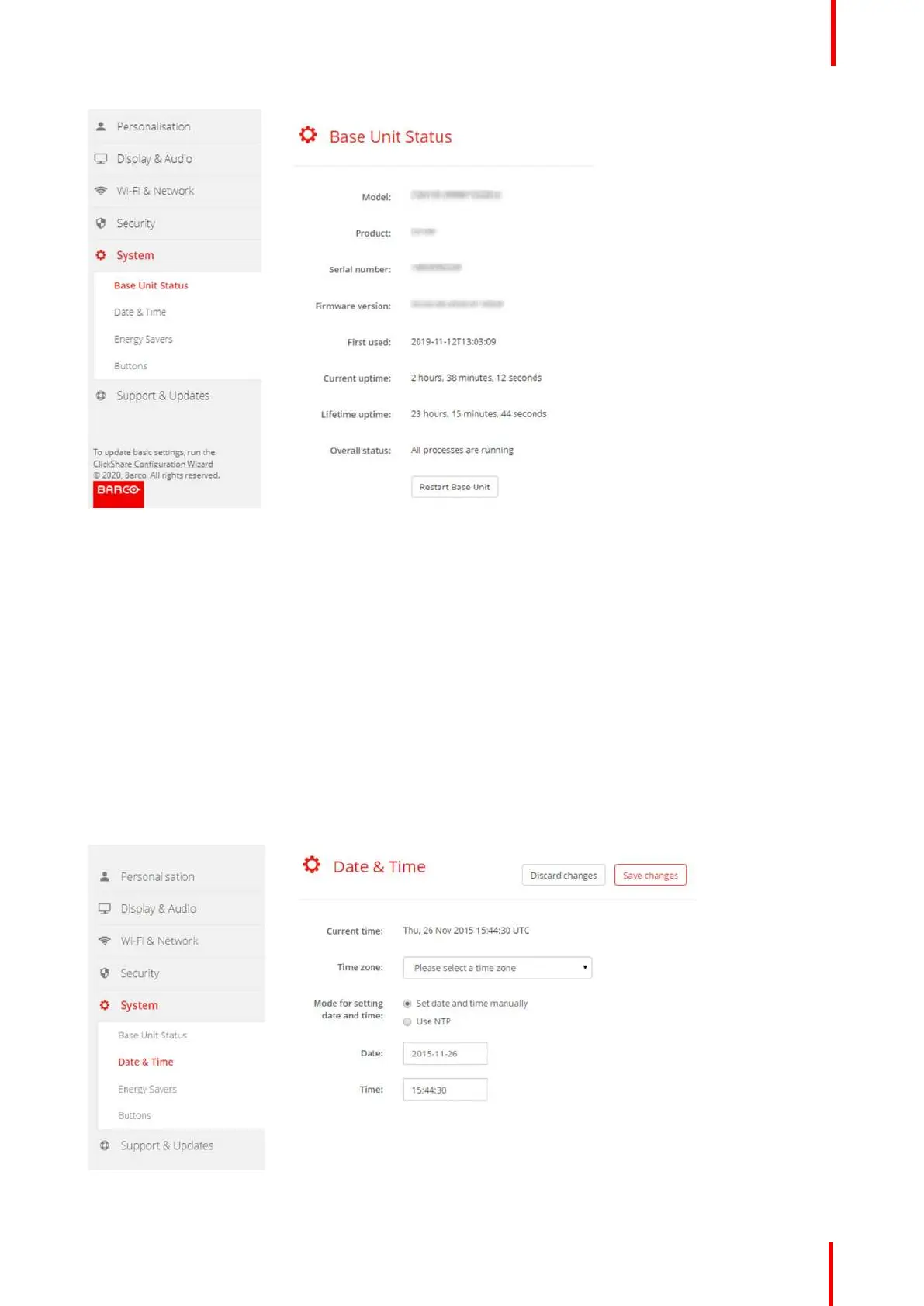 The date and time can be set manually using the time zone indication or using at least one NTP servers.