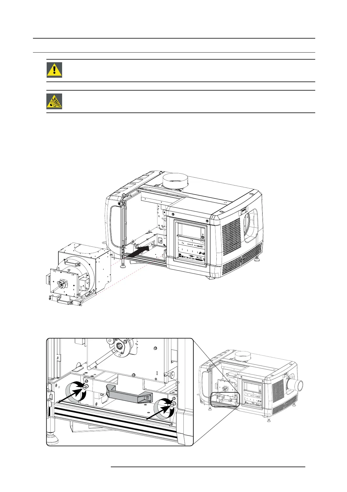 1. Gr ip the lamp house by both handles and place the front of the lamp house on the base plate inside the lamp comp