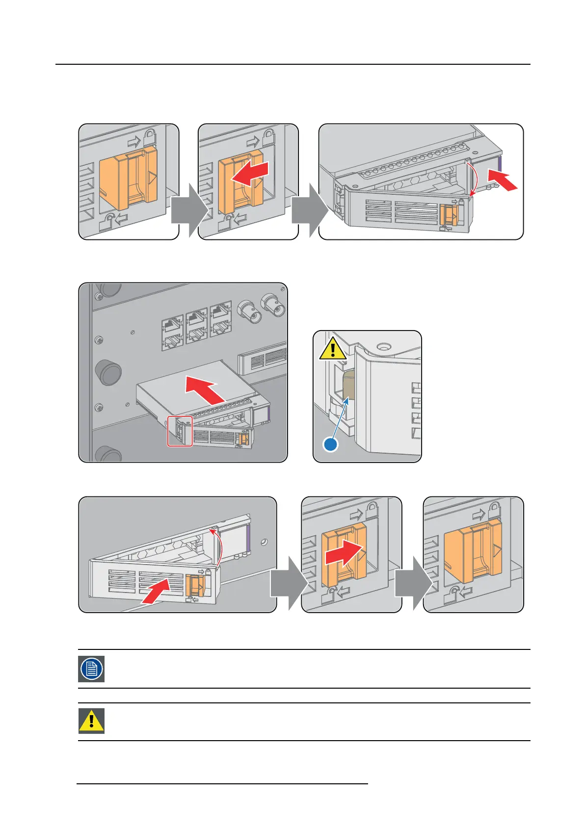 3. Insert the HDD into the HDD slot. Ensure that the handle is sufficiently open so that the hook (reference 1) of the handle c an